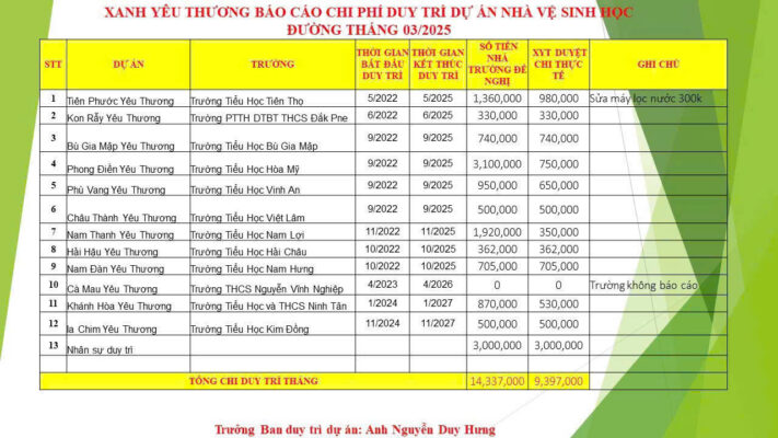🌱Mỗi một dự án Nước sạch và NVS HĐ sau khi được trao tặng, Xanh Yêu Thương vẫn sẽ tiếp tục đồng hành cùng nhà trường và học sinh trong công tác duy trì và bảo dưỡng dự án trong 36 tháng. Trên tinh thần đó, mỗi tháng XYT đều có kinh phí vệ sinh và bảo trì dự án đã trao tặng, chi tiết chi phí duy trì đã gửi về cho các trường sau khi xét duyệt của tháng 03/2025 như ảnh bên dưới.