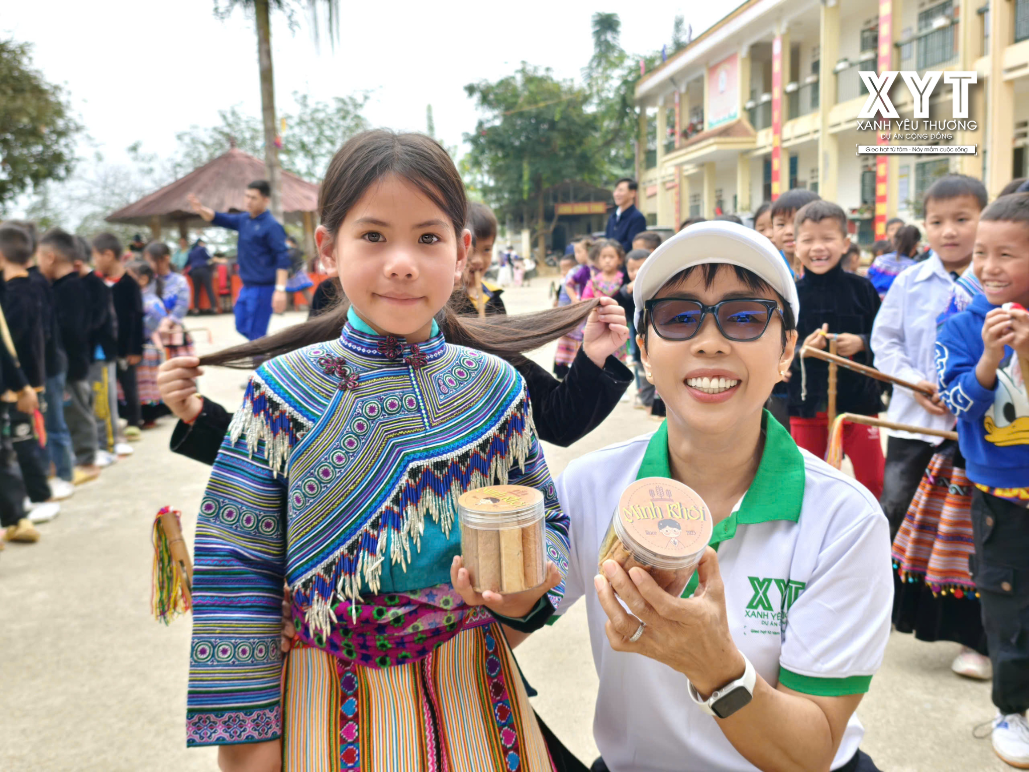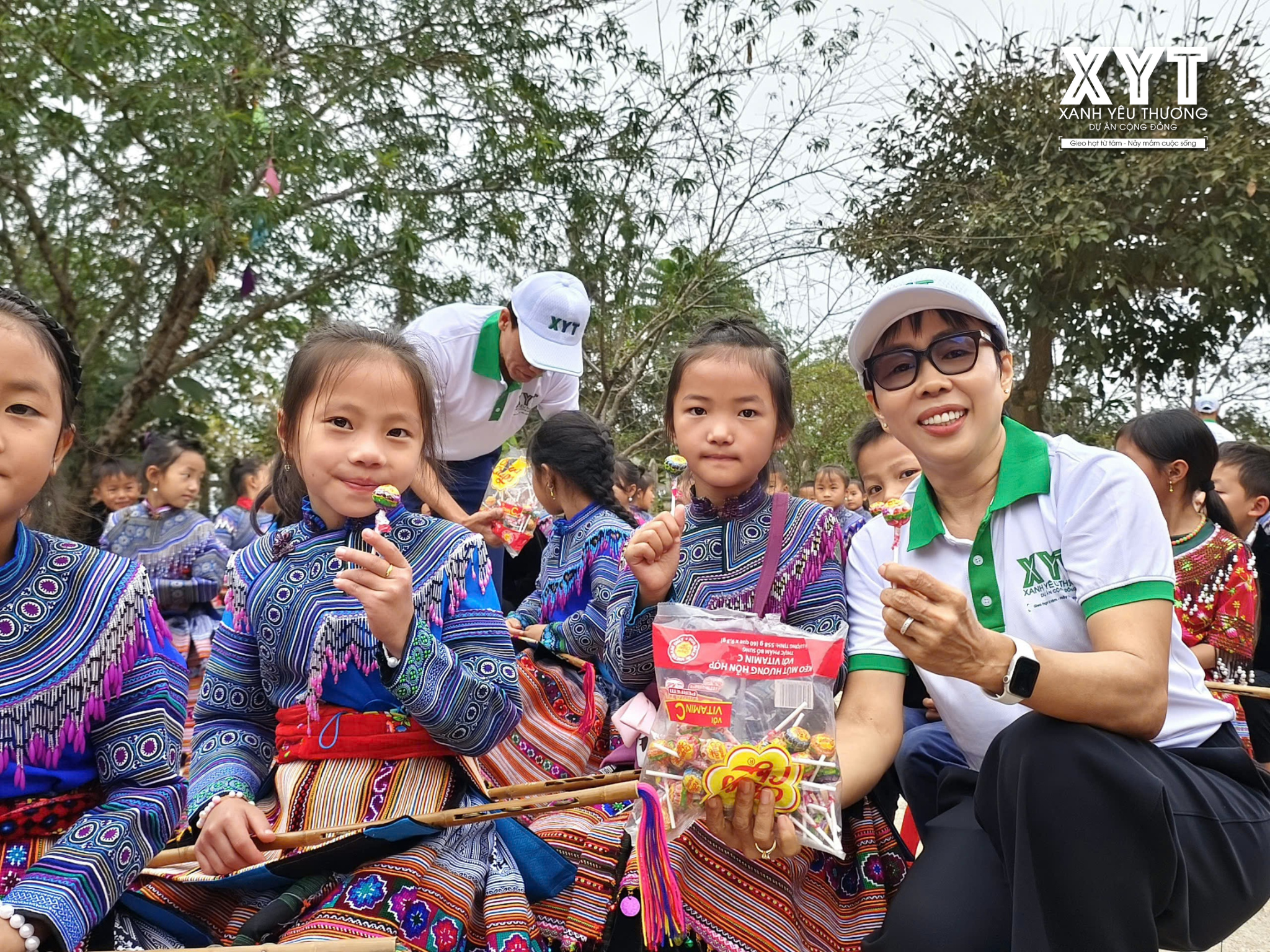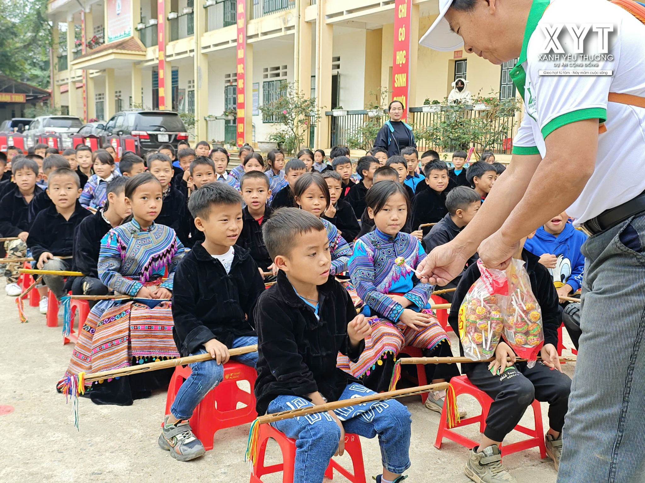 Ngoài ra, XYT còn tặng thêm 100 cái khăn và bánh kẹo cho các em học sinh.