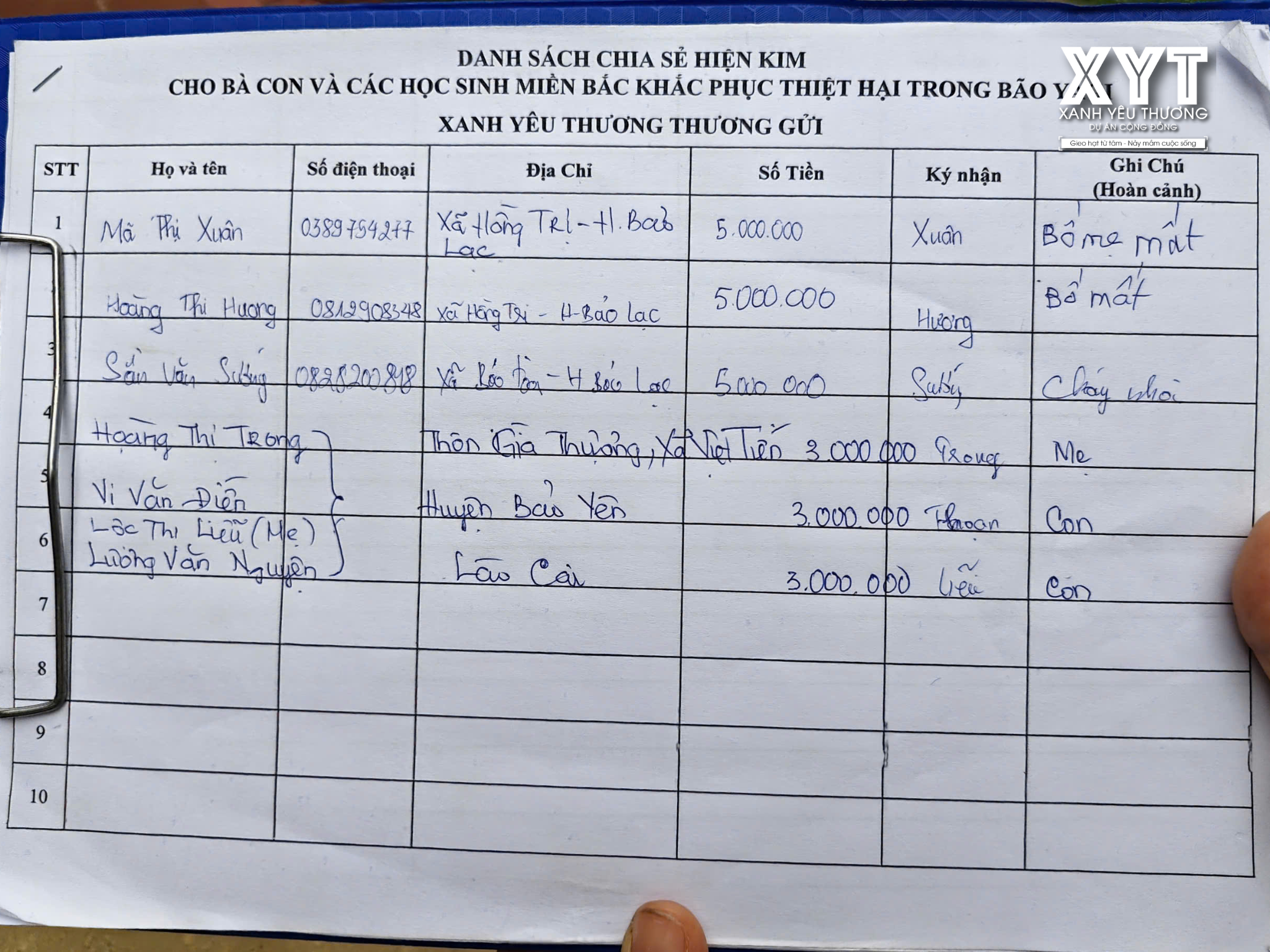 Gia đình Yêu Thương Biên Hòa quyết định gửi tặng cho XYT 127 triệu đồng để XYT trực tiếp hỗ trợ cho bà con, mỗi hộ gia đình một triệu đồng. Đồng thời, XYT cũng quyết định hỗ trợ thêm sự ba trường hợp đặc biệt, nơi người thân của họ đã mãi mãi không còn. Gặp gỡ chị H.T.T., người vợ của anh L.V.L., một trong những nạn nhân bị nhà sập đêm 10/9, chúng tôi không khỏi xót xa. Giọng chị run rẩy: “Anh ấy bỏ lại tôi cùng hai đứa con thơ và mẹ già… Cơn bão đã lấy đi tất cả.”
